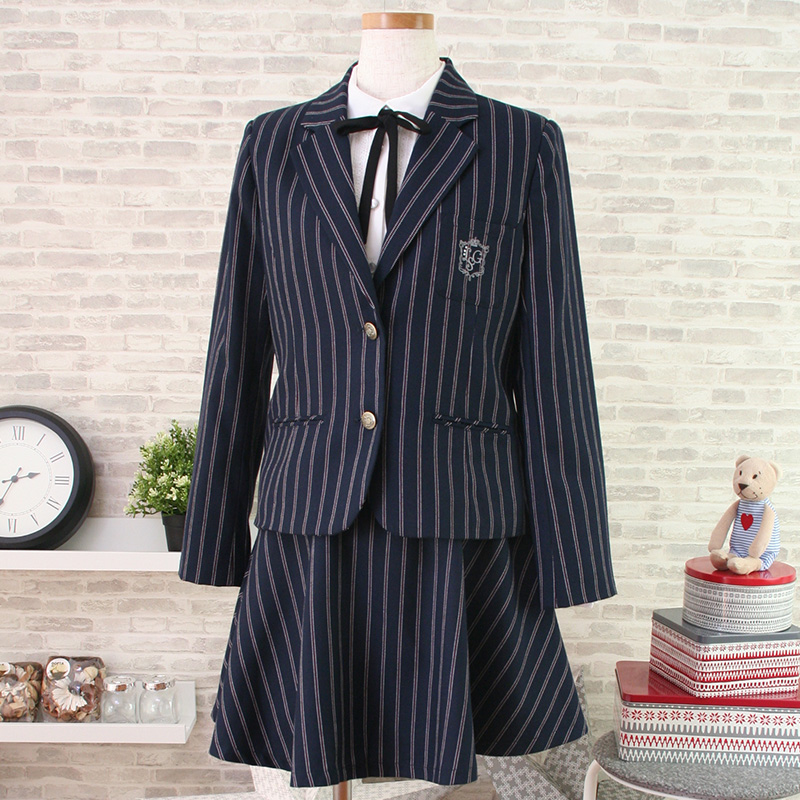 ●マニッシュな縦ラインのジャケットとフレアスカートに黒の棒タイが可愛らしいアンサンブルスーツ。